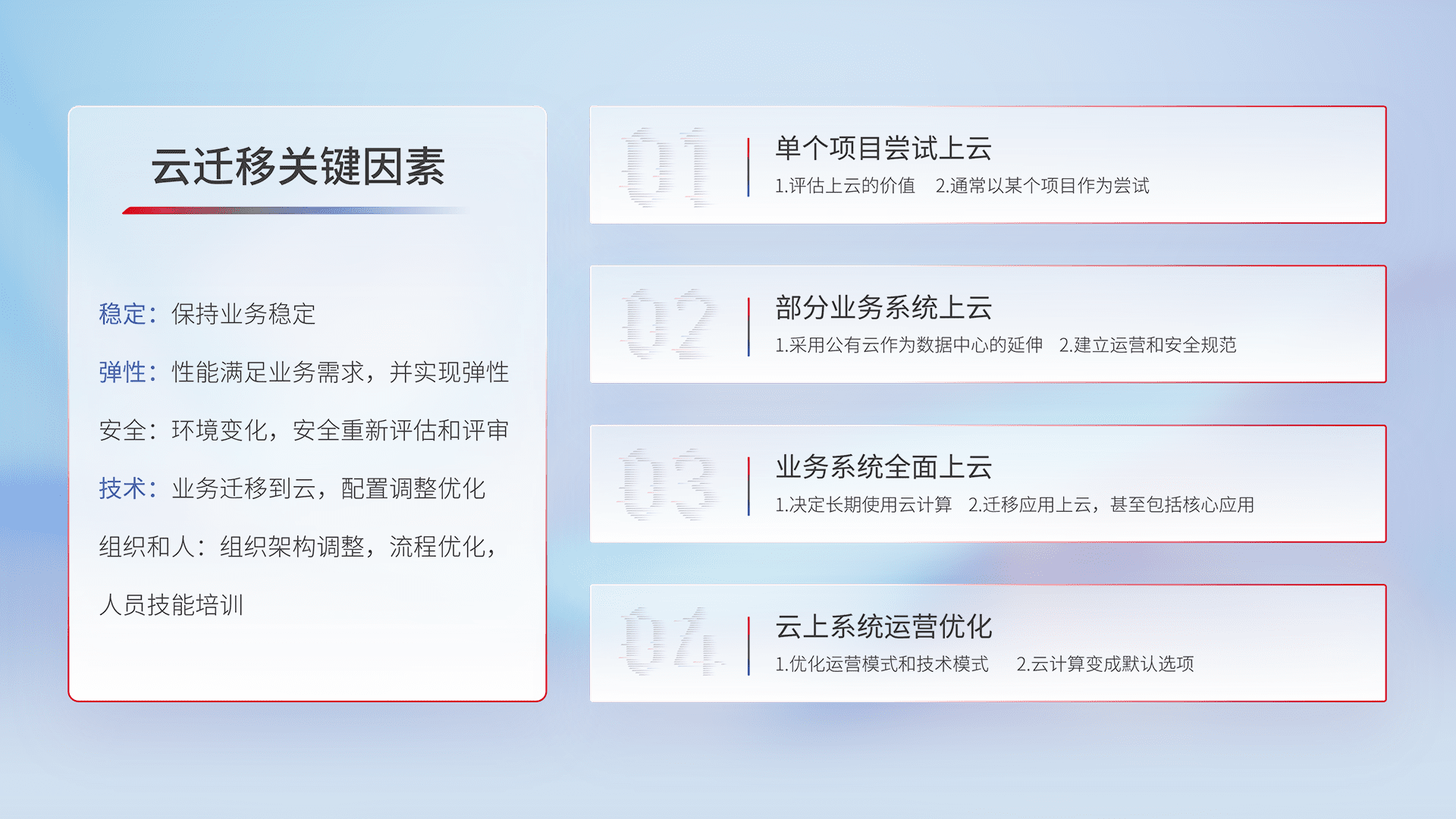 结合实际业务,,,,从规划设计、、云平台选型、、、云原生改造、、数据迁移、、、、集成交付,,迁移全过程为客户识别最佳上云路径,,做好风险识别管理,,,设计网络架构、、身份权限、、、安全审计合规、、、、操作审计、、、日志审计、、、、监控告警策略、、、、多站点容灾设计等,,对云上基础设施进行整体规划,,,提升IT治理水平,,,以满足弹性、、、、高可用、、、高性能的需求。。