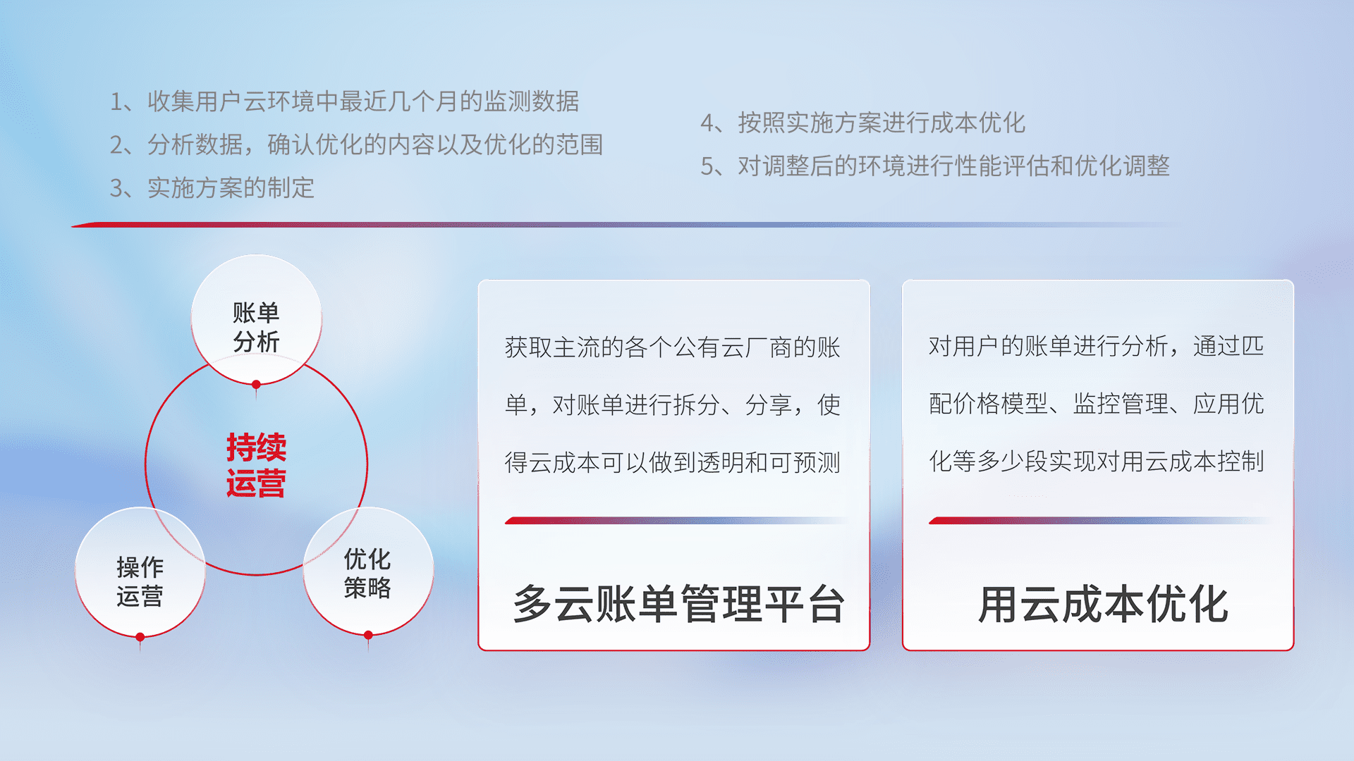 通过多云纳管,,,以统一的资源数据模型把客户的云资源进行抽象和封装,,,,进而实现对多云资源的统一操作,,,,保障云资源管理的可靠性、、、稳定性与可用性。。。量身定制化运维内容,,配置、、、开发运维、、、、补丁管理、、、、备份、、监控、、、、认证和访问管理、、审计和日常巡检等,,保障在用云过程中的可靠度,,,,稳定度以及高可用率。。