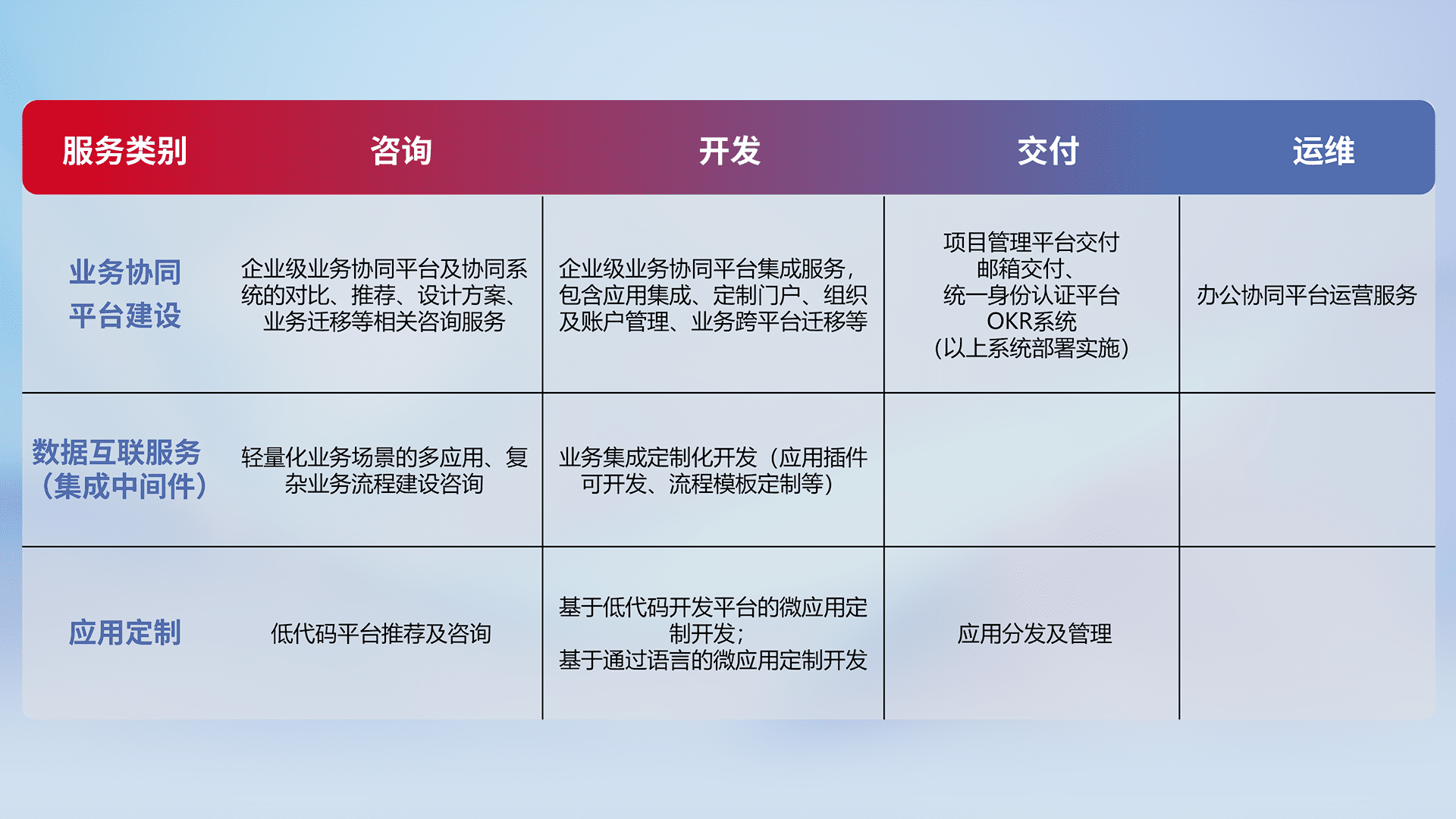 针对钉钉、、、企微、、IDaas等平台级产品提供产品的规划、、、方案、、交付、、定制化开发等服务,,,,实现如统一协同办公、、、、智能客户服务、、混合会议管理、、智能数据查询、、、、等业务场景,,,,实现数字化转型。。。